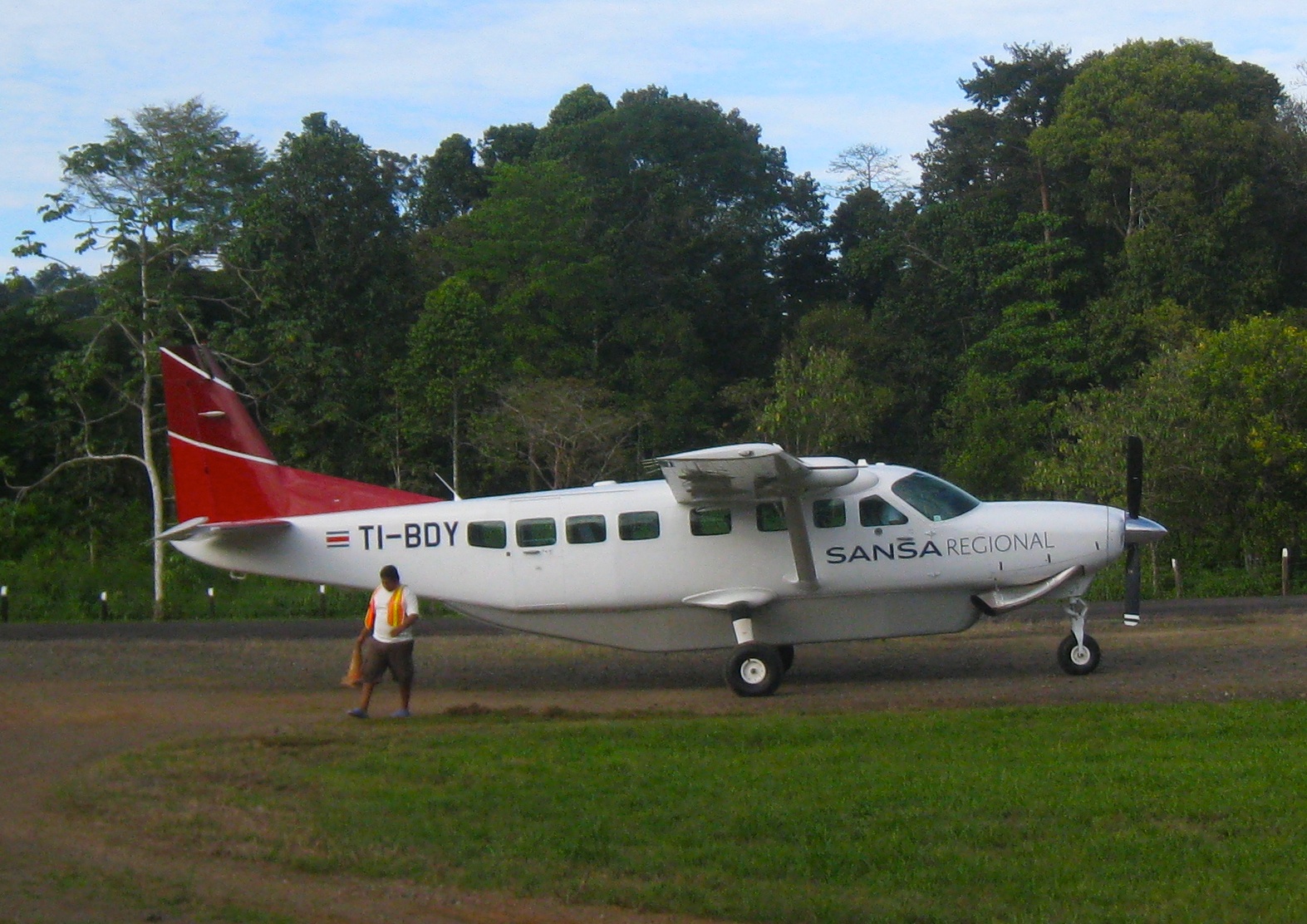 Most people go to Bahìa Drake by boat from Sierpe (that’s an adventure in itself!), because they’re coming from Manuel Antonio, a touristy all-signs-are-in-English beach town up the coast. But I opted to fly directly from San Jose. Only two airlines fly into Bahìa Drake: at $130 US, Sansa (which flies out of a teeny airport a block down the road from Juan Santamaria) was more expensive than NatureAir (which flies out of Pavas International Airport, 16 km from Juan Santamaria International Airport), but I could walk to the airport. It’s a wee plane that flies to Bahìa Drake. As you can see above, Sansa‘s airplane is like a school bus! I count nine passenger seats. Nine! And I don’t know why they bothered to weigh both me and my bags, because I was the only passenger! Yes, you read right: I had my own private flight. Needless to say, I sat behind the pilot – one row back, so I could grip the back of the seat in front of me the entire flight. Exciting way to start of my trip indeed! With gorgeous views, natch.