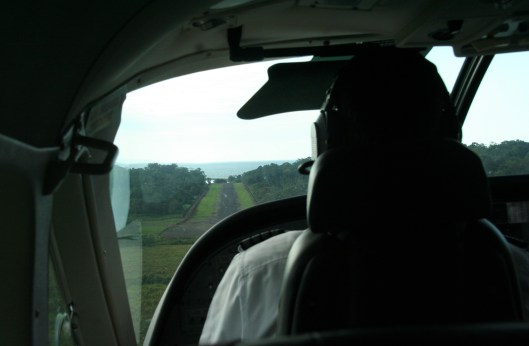 I had to take a shot of us landing. There we were, with the land to our left, flying south, when the pilot (there he is!) turned the plane to the left, bringing us round to face the Pacific Ocean. And down we went. Quickest. Landing. Ever. And freakiest, too, ’cause all I could see – between us and the rapidly approaching ocean (there it is!) – was an itty-bitty strip of grass and dirt in the middle of the jungle (that’s there too!). That was the landing strip!