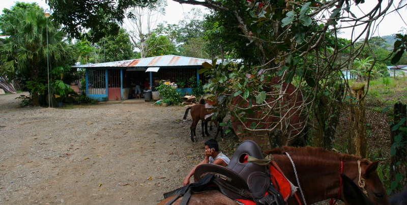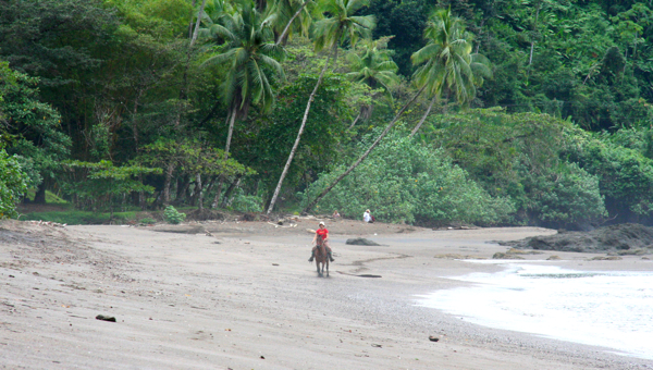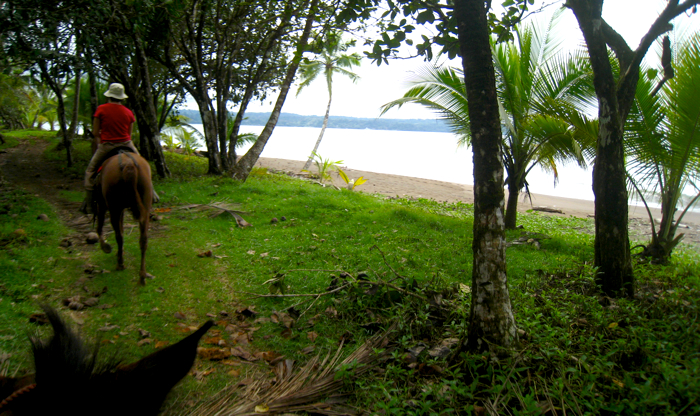And it’s really rugged out there too, as I’ve said before. Those monkey bridges are some of the only bridges in the area. When we reached the Rio Drake, our horses continued right on through it without a pause! I’d crossed the river by car the same way the day I arrived – and, lemme tell you, I thought our car was going to get stuck. No worries about our horses getting stuck, though I did fear I’d fall off Coyote, thus I gripped the reins mighty tight.