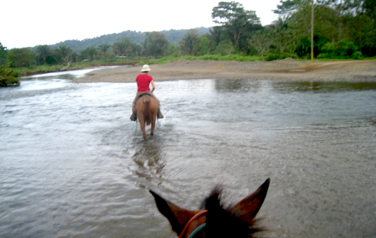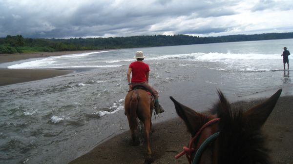 We ended up riding two kilometres back along the beach, which you can only do at low tide because at high tide stretches of the beach completely disappear under the water! When we reached the Rio Drake, our horses plowed right on through again, the rushing water coming up to their bellies.